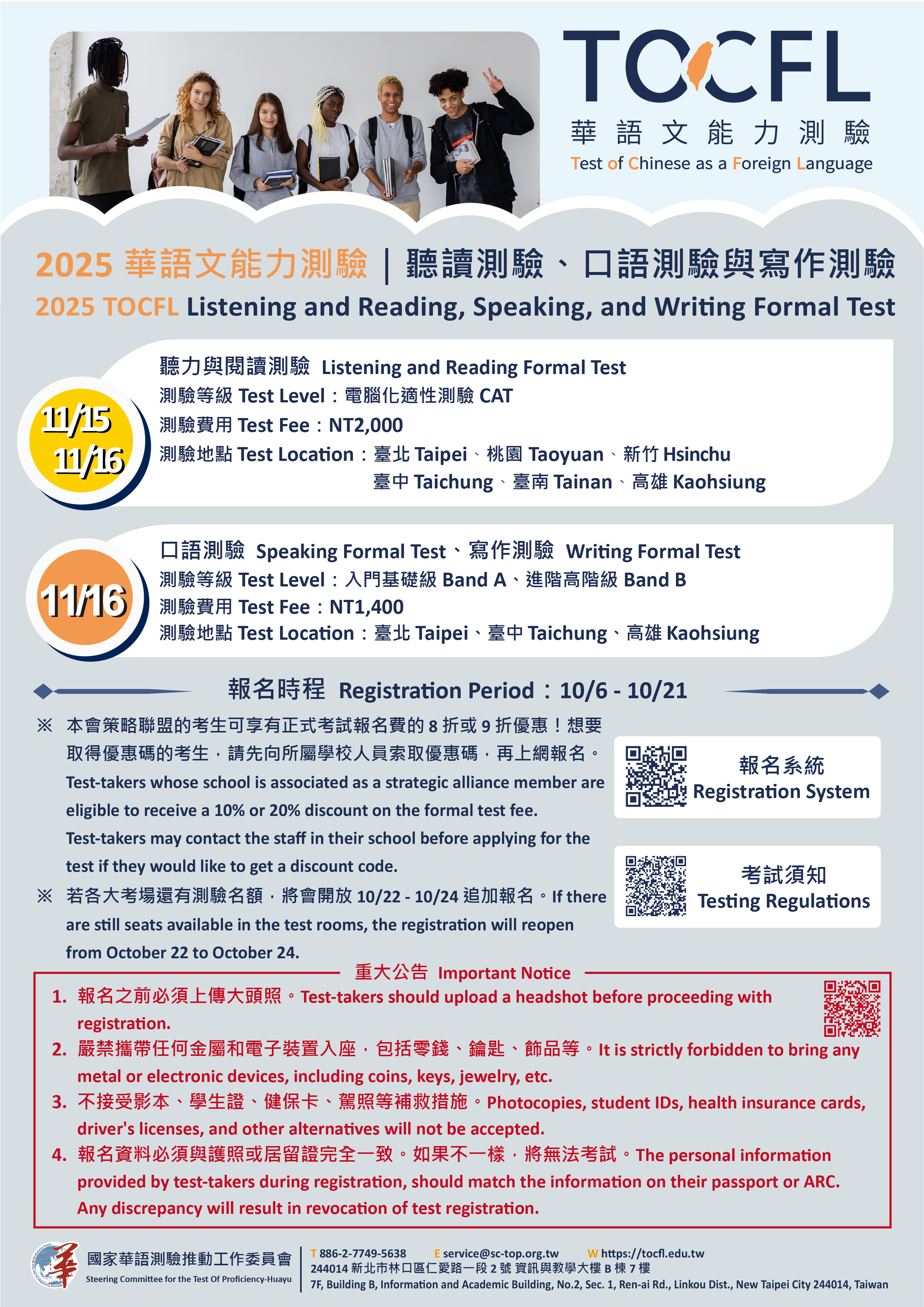TOCFL華語文能力測驗將於2025年11月15-16日舉行全國正式考試,歡迎母語非華語之人士報考。座位有限,請儘早報名!考試資訊如下: